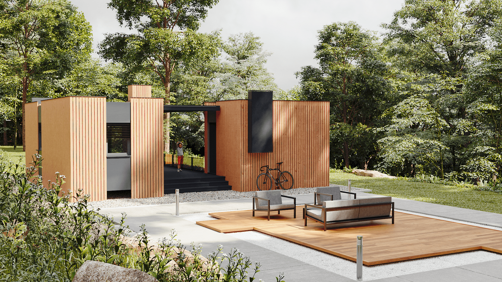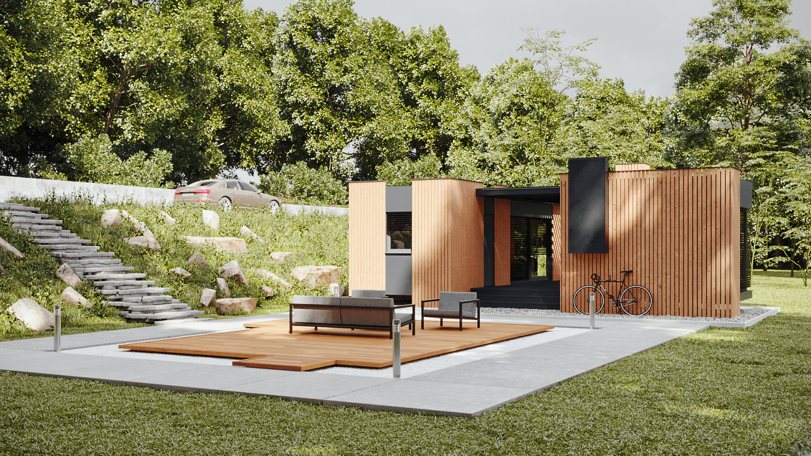 MMH21_M.02 ist eine modulare Einheit bestehend aus zwei mobilen Einrichtungen, die für vier Personen ausgelegt sind. Eine große Holzterrasse ist ein Ort der Begegnung und Geselligkeit und verbindet Wohn- und Schlafzimmer. Die Terrasse kann mit einem Standard-Grillmodul sowie einer bioklimatischen Pergola ausgestattet werden, um Ihren Aufenthalt in der Natur angenehm zu gestalten. Modernes Design folgt jedem Segment der Komposition, was sie vollständig und erkennbar macht. MOBILISIEREN SIE IHR ZUHAUSE!